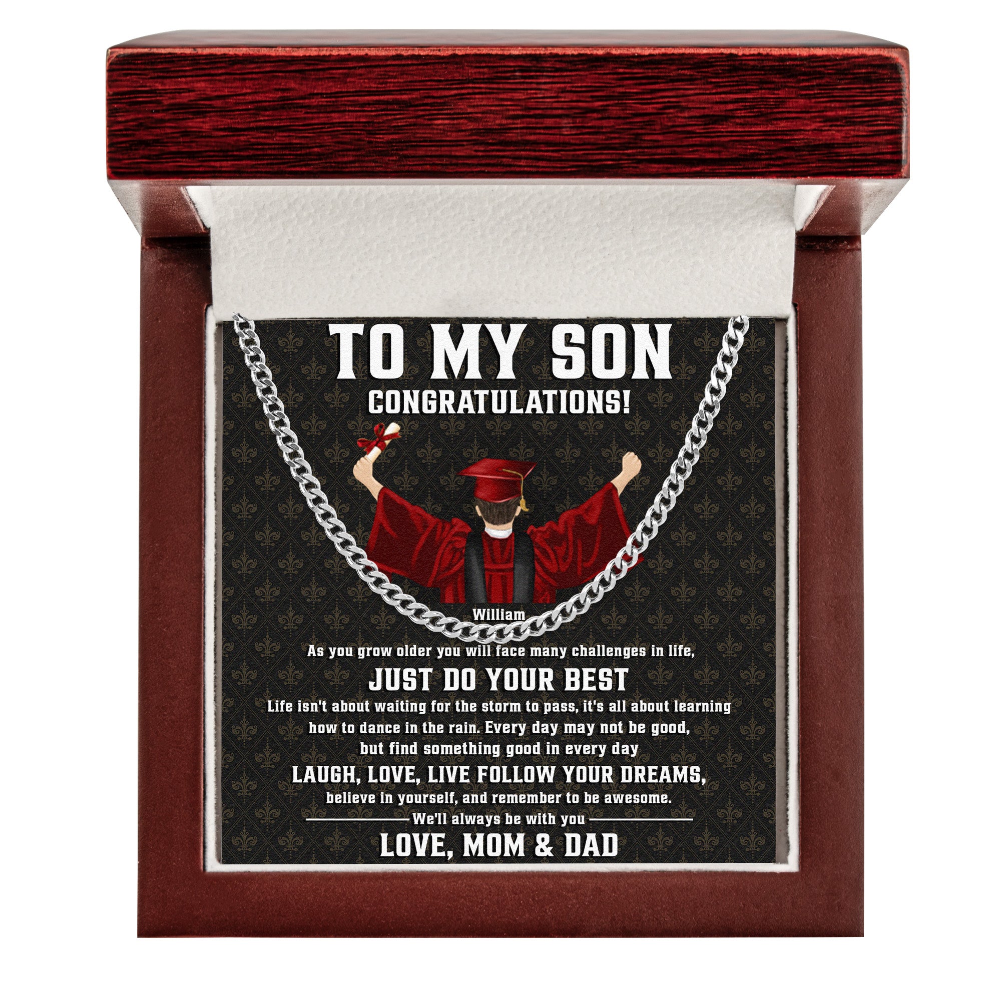 Crafted with high-quality stainless steel and featuring a secure clasp, this sleek and masculine chain is a meaningful reminder of his strength, determination, and success. Personalize it with his name, graduation year, or a heartfelt message to make it an unforgettable keepsake.
