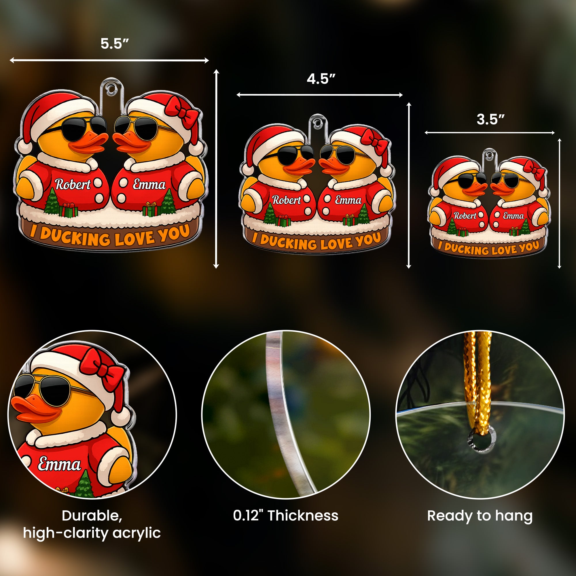 Sprinkle some humor and love this Christmas with our uniquely shaped "I Ducking Love You" acrylic ornament. This custom shaped ornament, perfect for couples or family members, radiates a fun bonding experience and offers an uncanny resemblance of your love for one another. It's an exceptional representation of heartfelt feelings, amplifying the joy of your own personalized message without directly quoting it. Who wouldn't love a twist on typical holiday decor with such a unique statement piece?