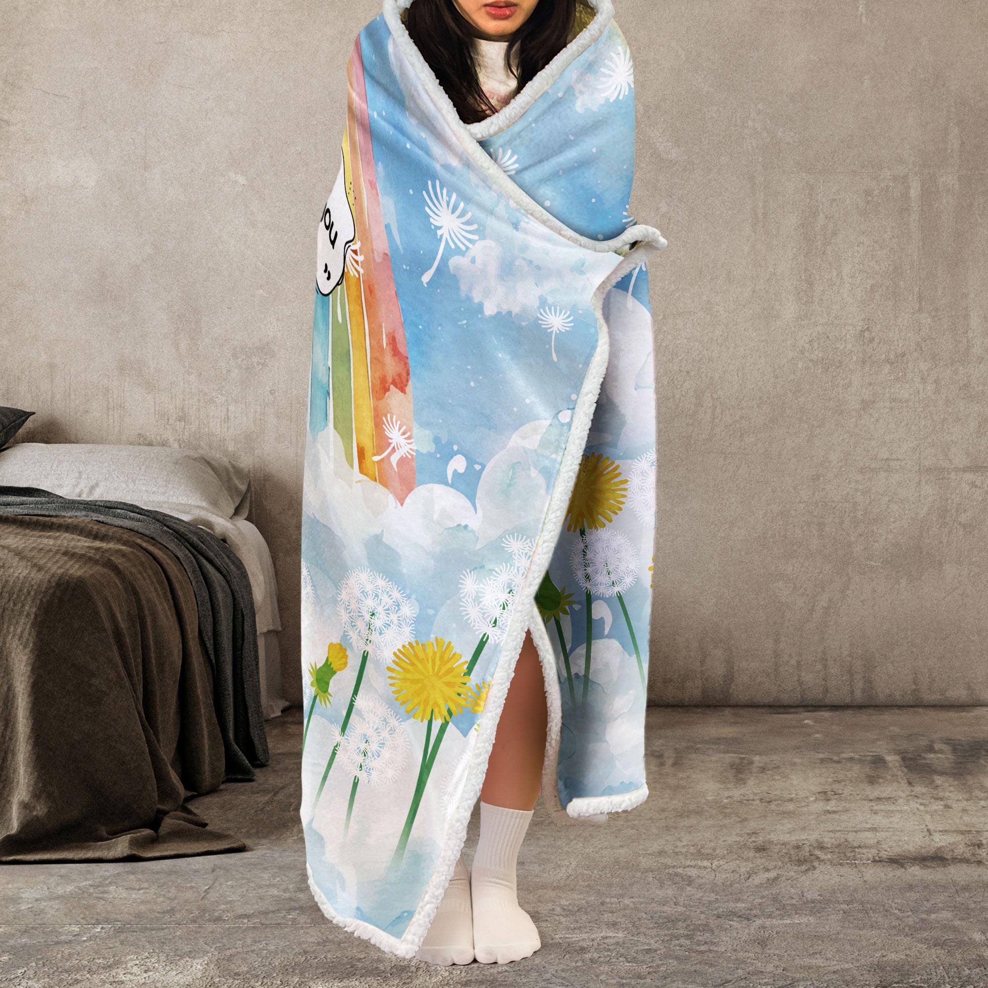 - The attached hood and mittens provide additional warmth for the head and hands, making it ideal for lounging or staying cozy during cold weather.