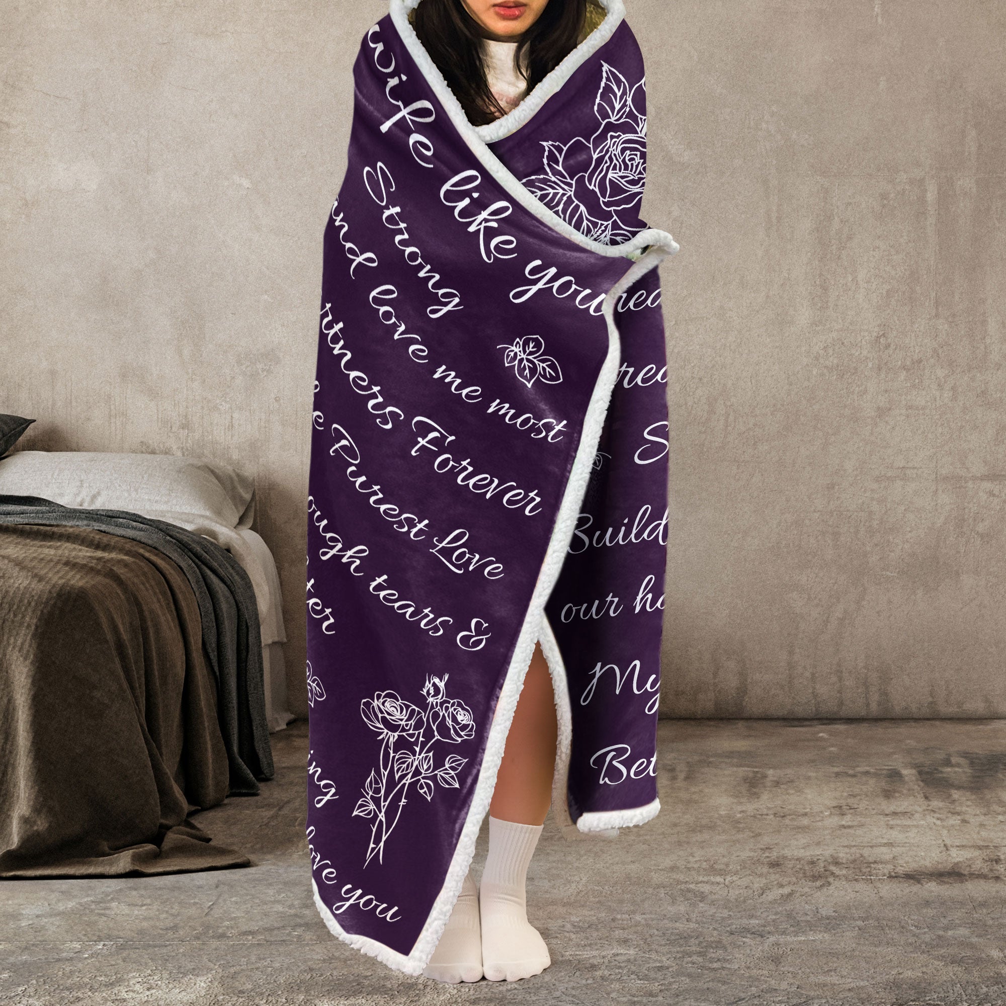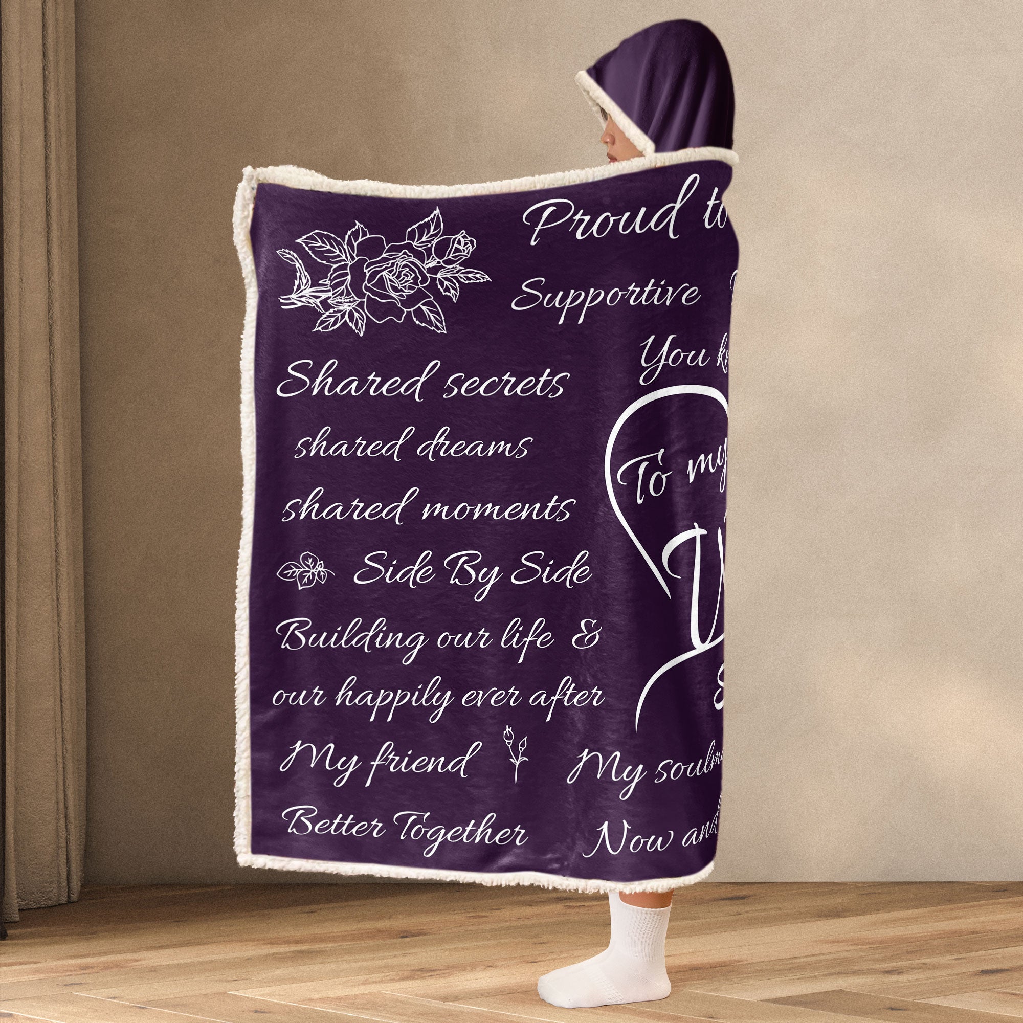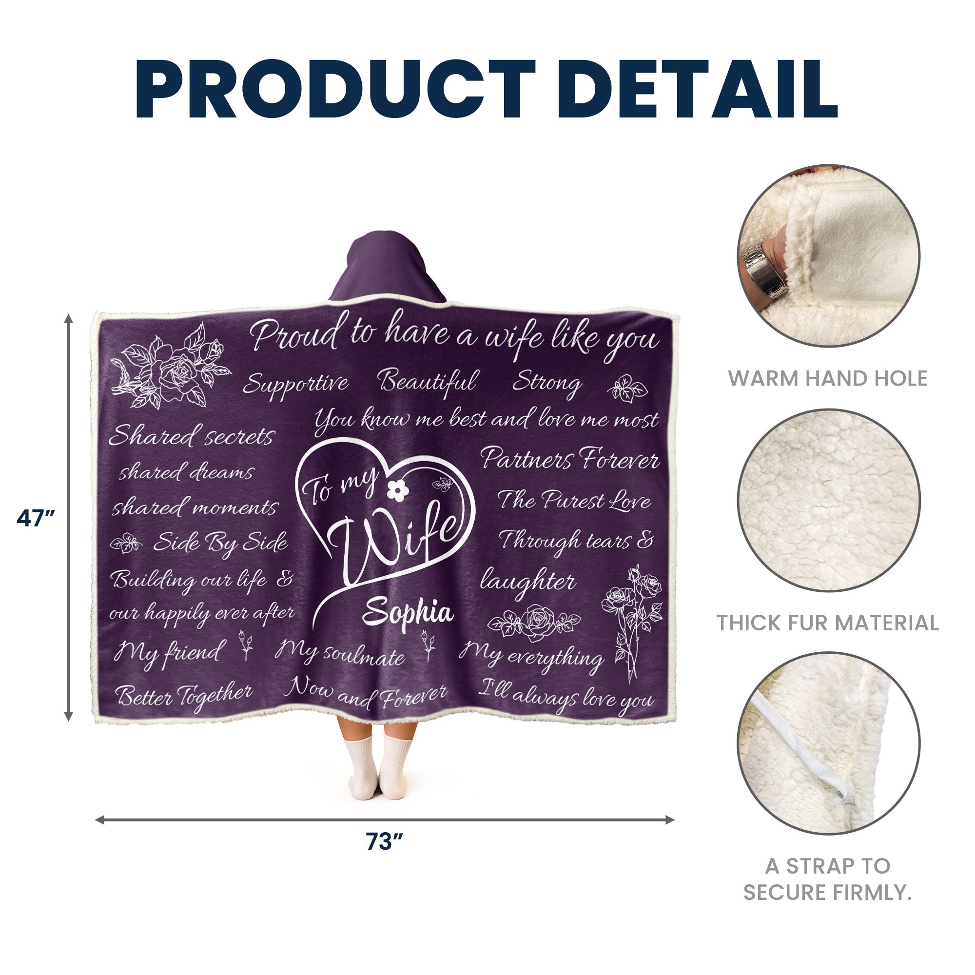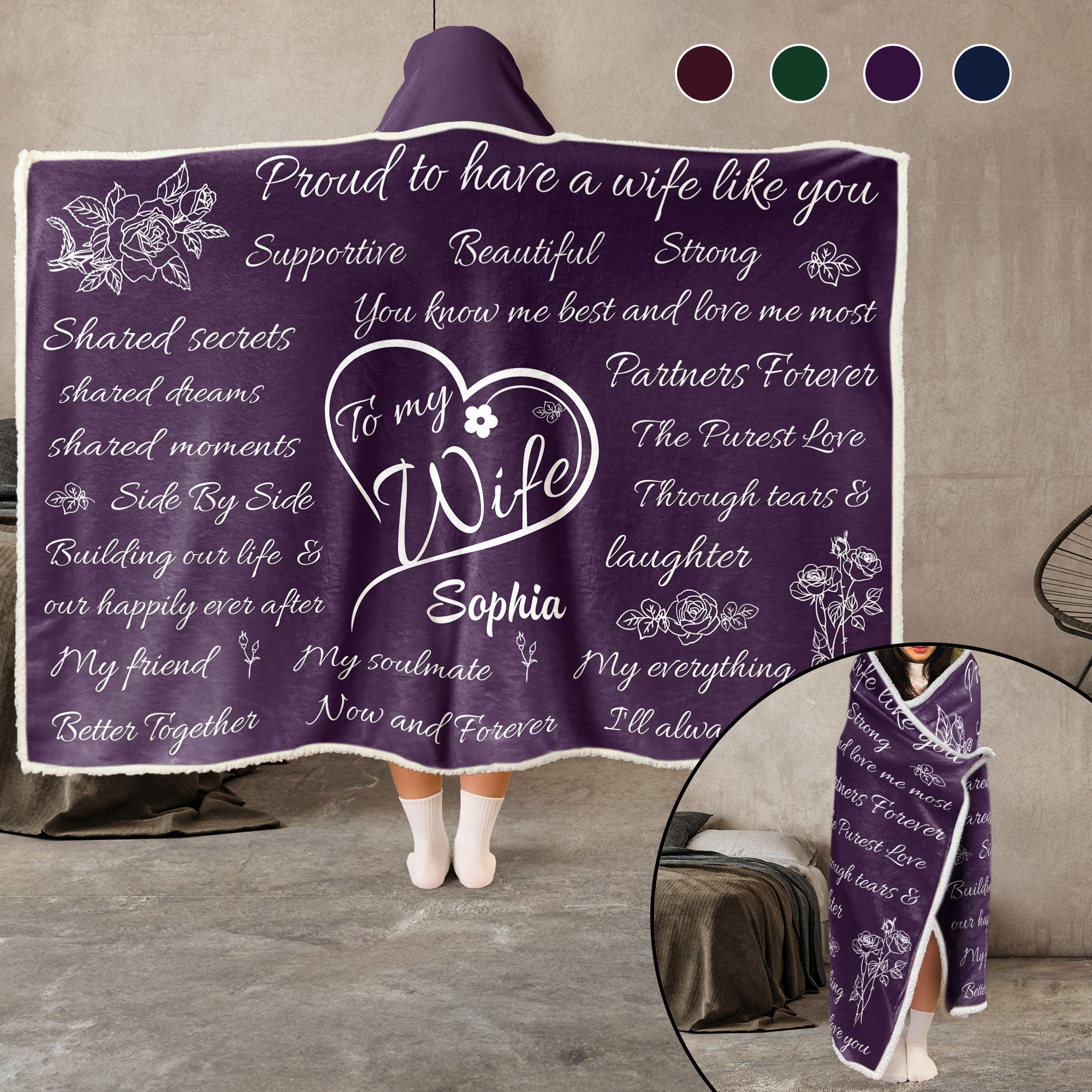 Wrap your wife in warmth and love with our Personalized Wearable Hooded Blanket, featuring the heartfelt message: "To my wife... Proud to have a wife like you." This cozy blanket is a beautiful tribute to your relationship, celebrating shared secrets, dreams, and moments. Customize it with your wife's name to make it an extra-special keepsake, perfect for showing how much she means to you.