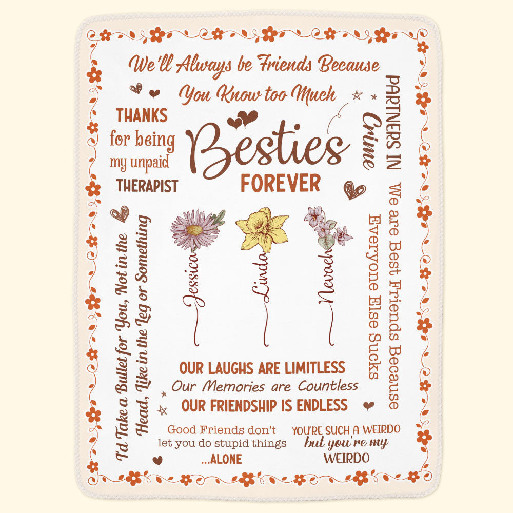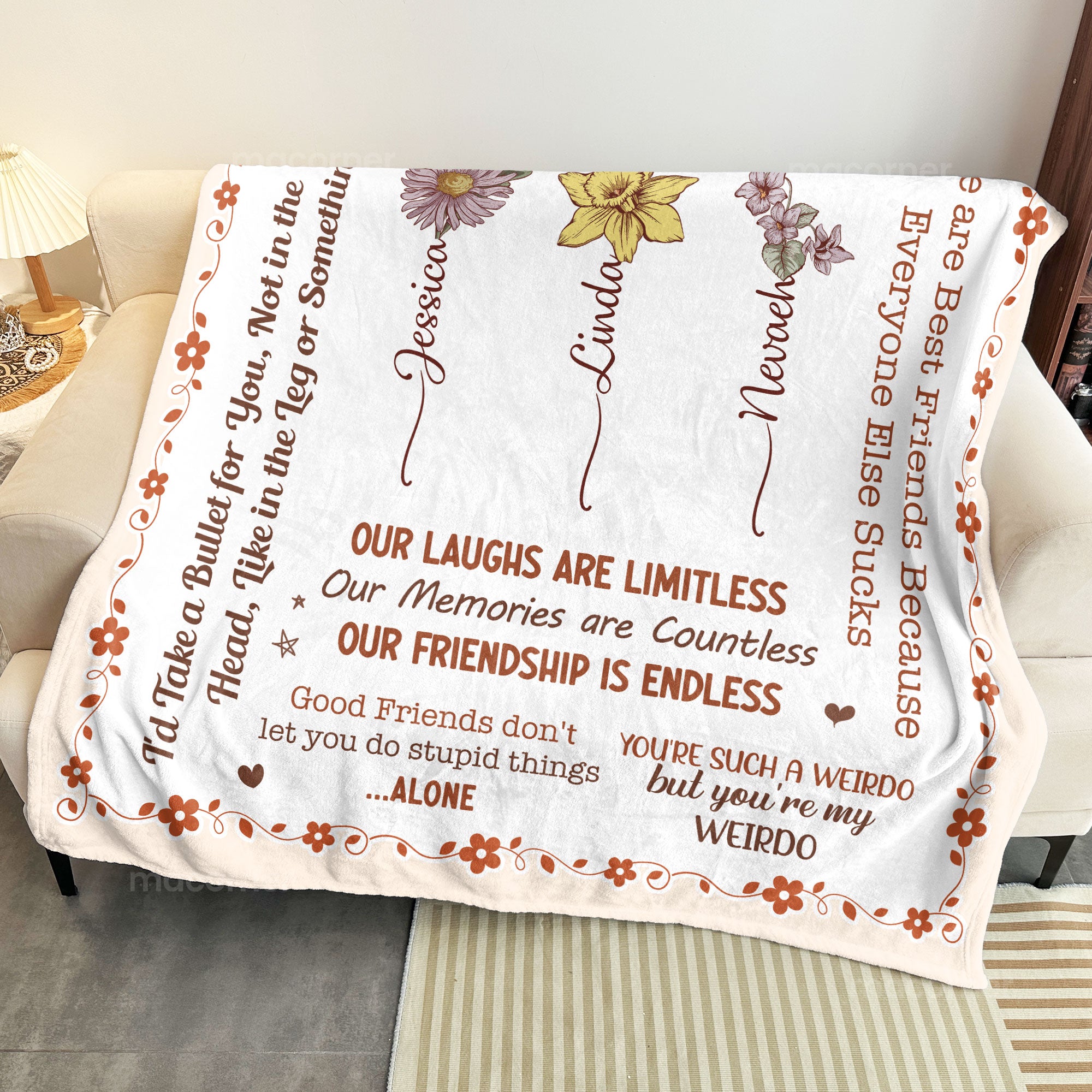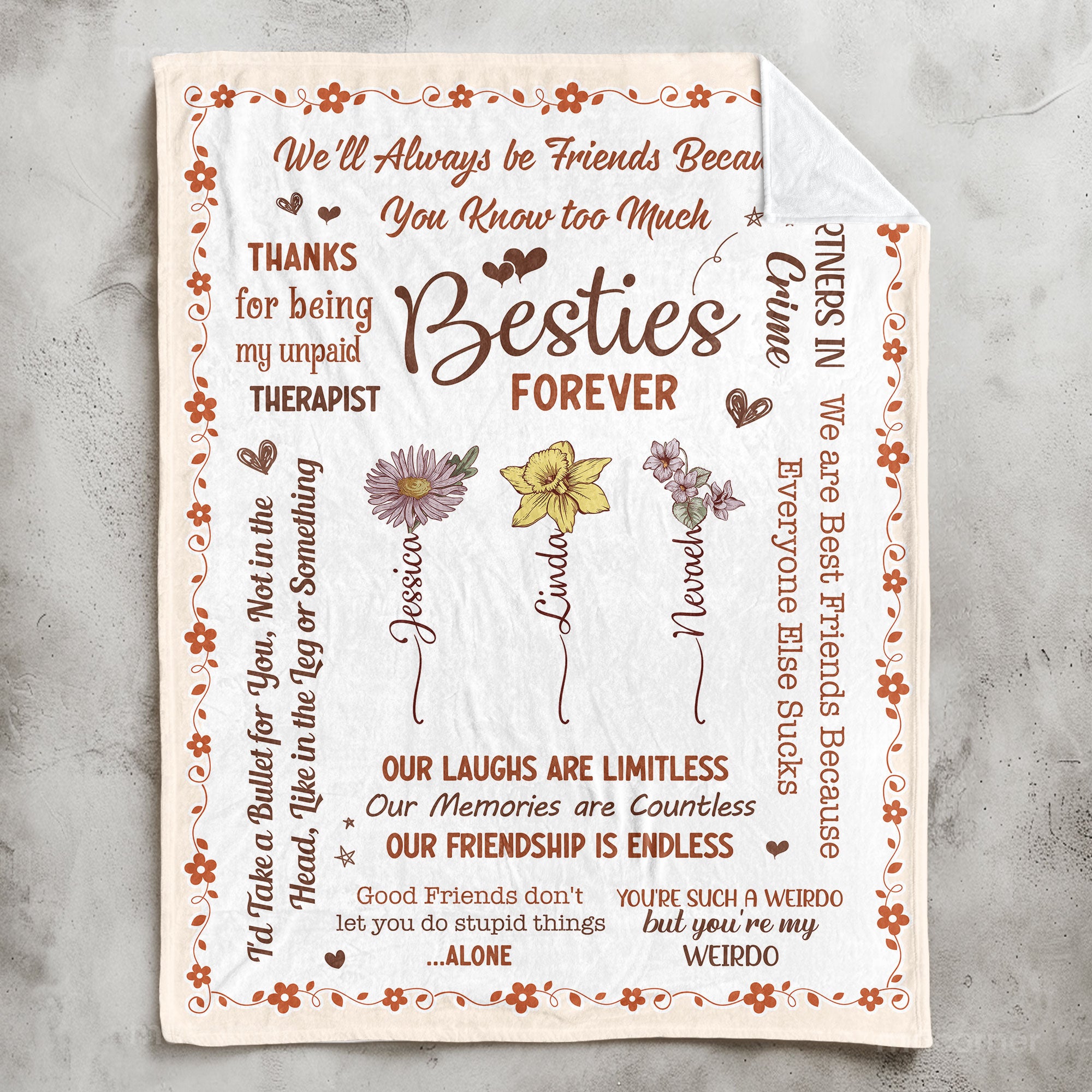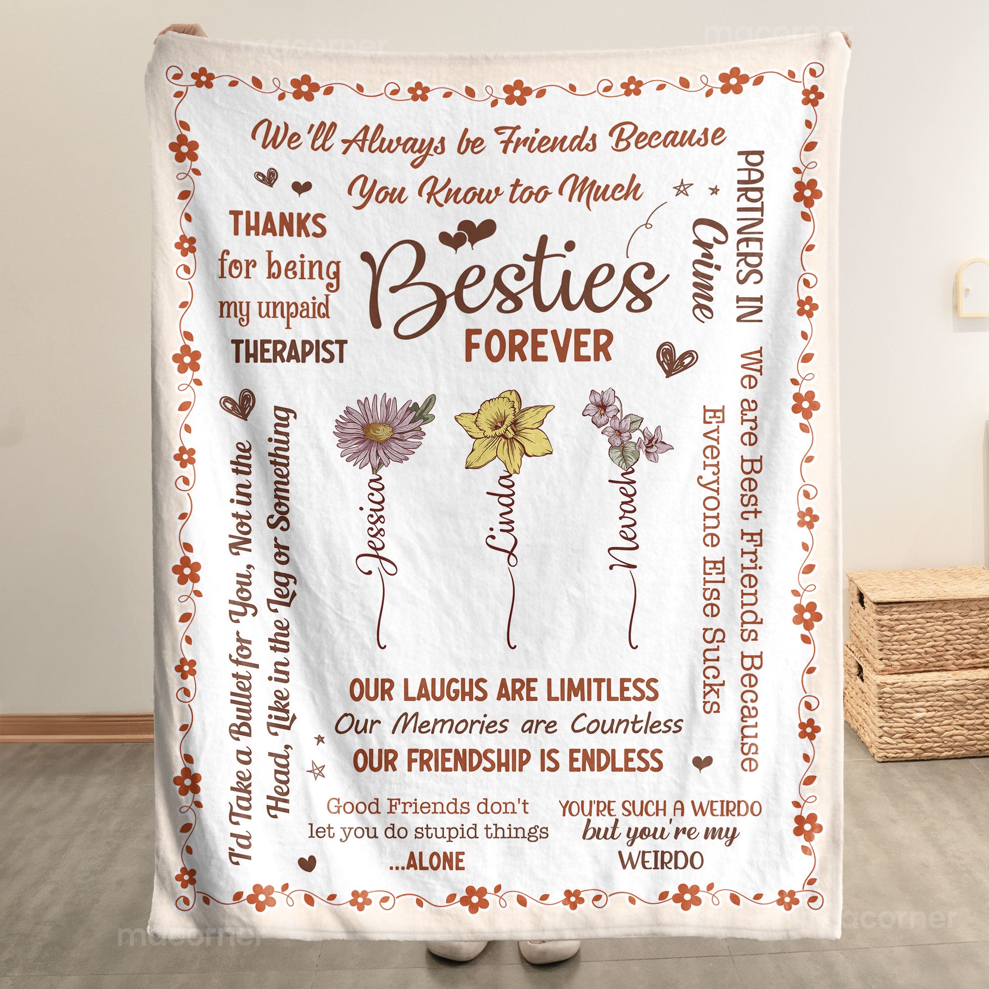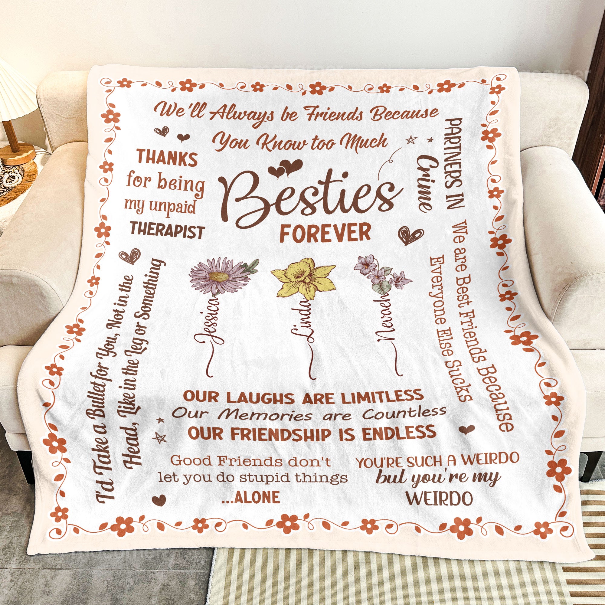 For best friends, childhood pals, college roommates, bride tribe, mom squads, coworkers or any close-knit pair, a personalized friend blanket is a thoughtful gift. This unique creation provides lasting comfort while celebrating the sincerity and laughs that make your bond unbreakable.