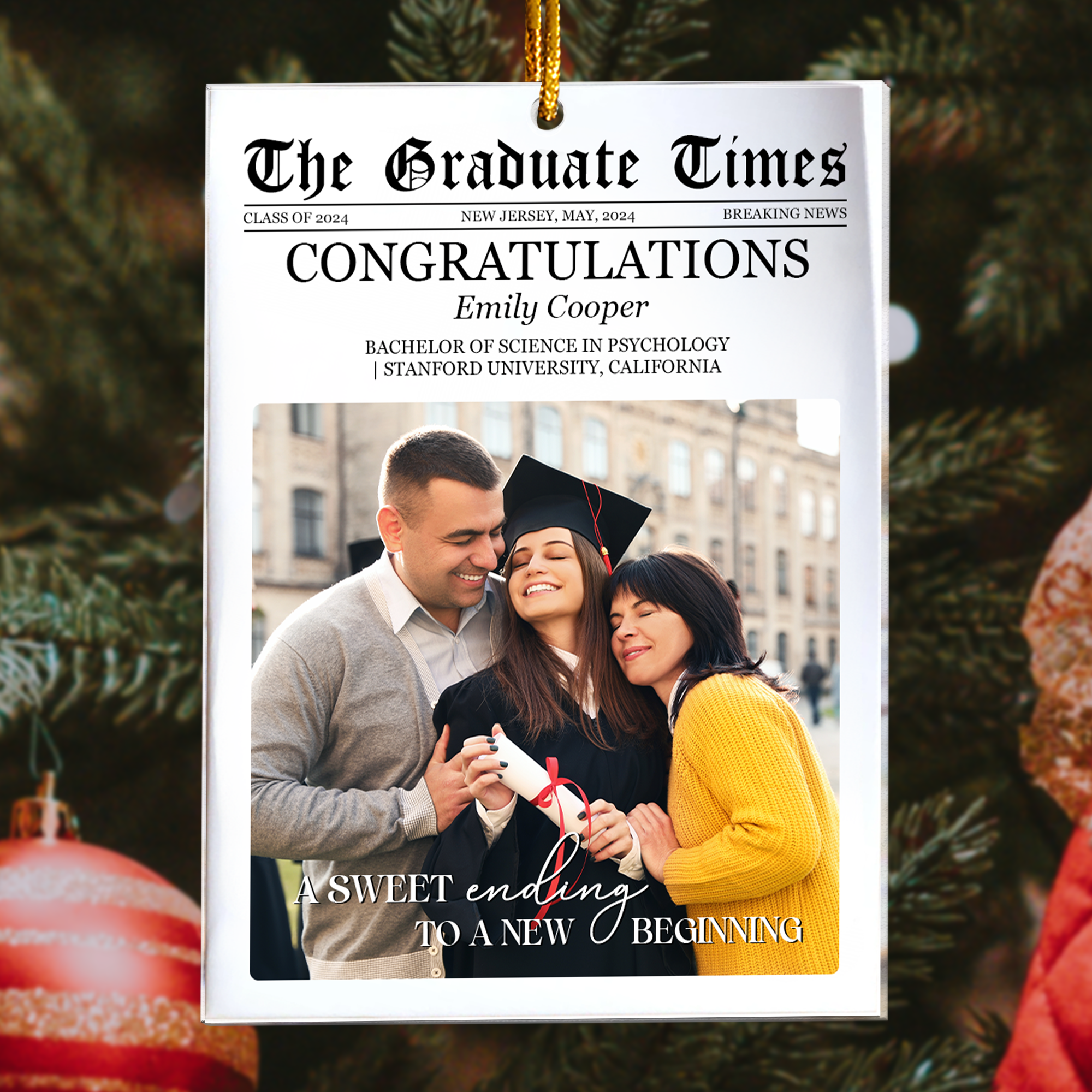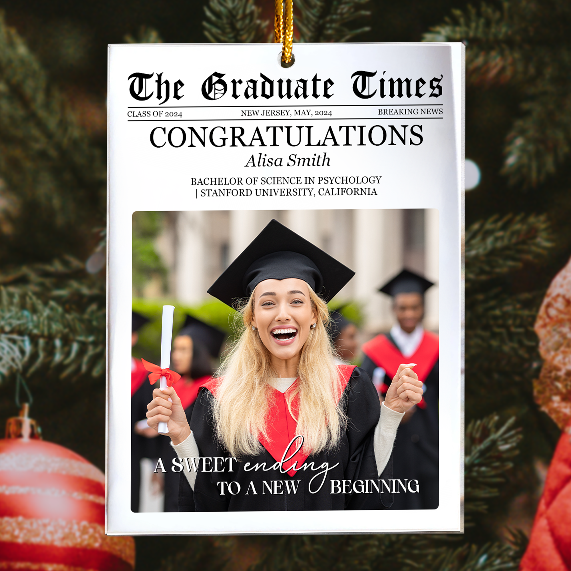 Celebrate the milestone of graduation with The Graduate Times - A Sweet Ending To A New Beginning Personalized Acrylic Photo Ornament! This unique and heartfelt Personalized Graduation Ornament is a perfect way to commemorate a special achievement. Whether it’s for high school or college, this ornament makes an ideal High School Graduation Gift or College Graduation Gift for him or her. Personalized with a photo, it’s a meaningful keepsake that will remind the new graduate of their accomplishments and the exciting journey ahead. A thoughtful Graduation Gift for your loved ones as they step into their new beginning!