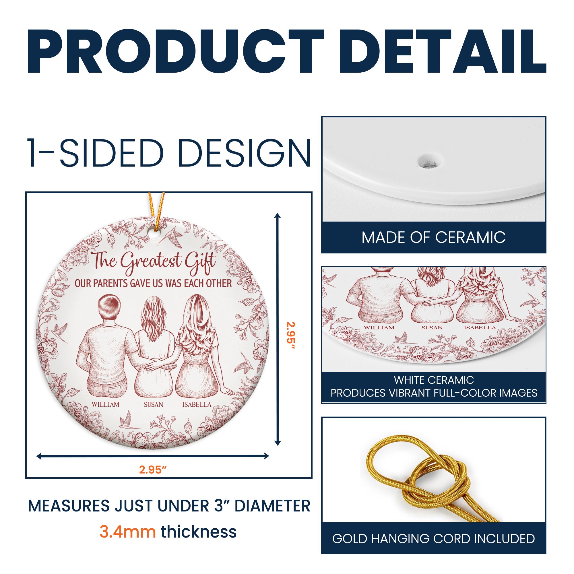 Introduce a special touch to your holiday decor with our beautifully Personalized Ceramic Ornament, titled 'The Greatest Gift They Gave Us'. It serves as a tribute to bonding and resemblance between family members, making it most suitable for siblings who share a deep connection. An excellent addition to any Christmas tree or home decor, each ornament embarks a special message. This ornament subtly pays homage to the precious gift of family, reflecting the sentiment that the best thing our parents ever gave us is each other.