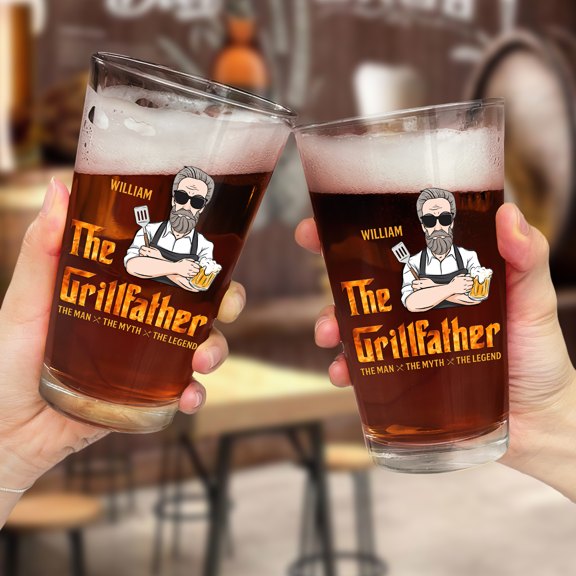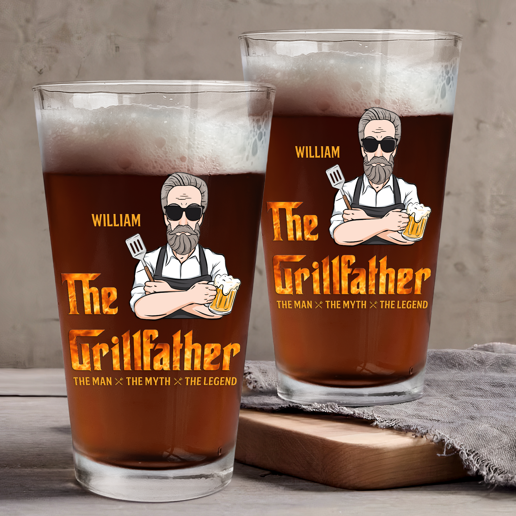 Looking for the perfect gift for the men in your life? Whether it's for your husband, papa, or dad, we've got you covered! Introducing our personalized beer glass: "The Grillfather - The Man, The Myth, The Legend." This beer glass is the ultimate gift for the dad who loves to BBQ. Whether it's for Father's Day, his birthday, Christmas, Thanksgiving, or retirement, this personalized glass is sure to make him smile. Crafted with care and precision, it's the perfect vessel for enjoying his favorite brew while manning the grill. Show your appreciation for Dad's legendary BBQ skills with this thoughtful and unique gift that he'll cherish for years to come. Cheers to the Grillfather!
