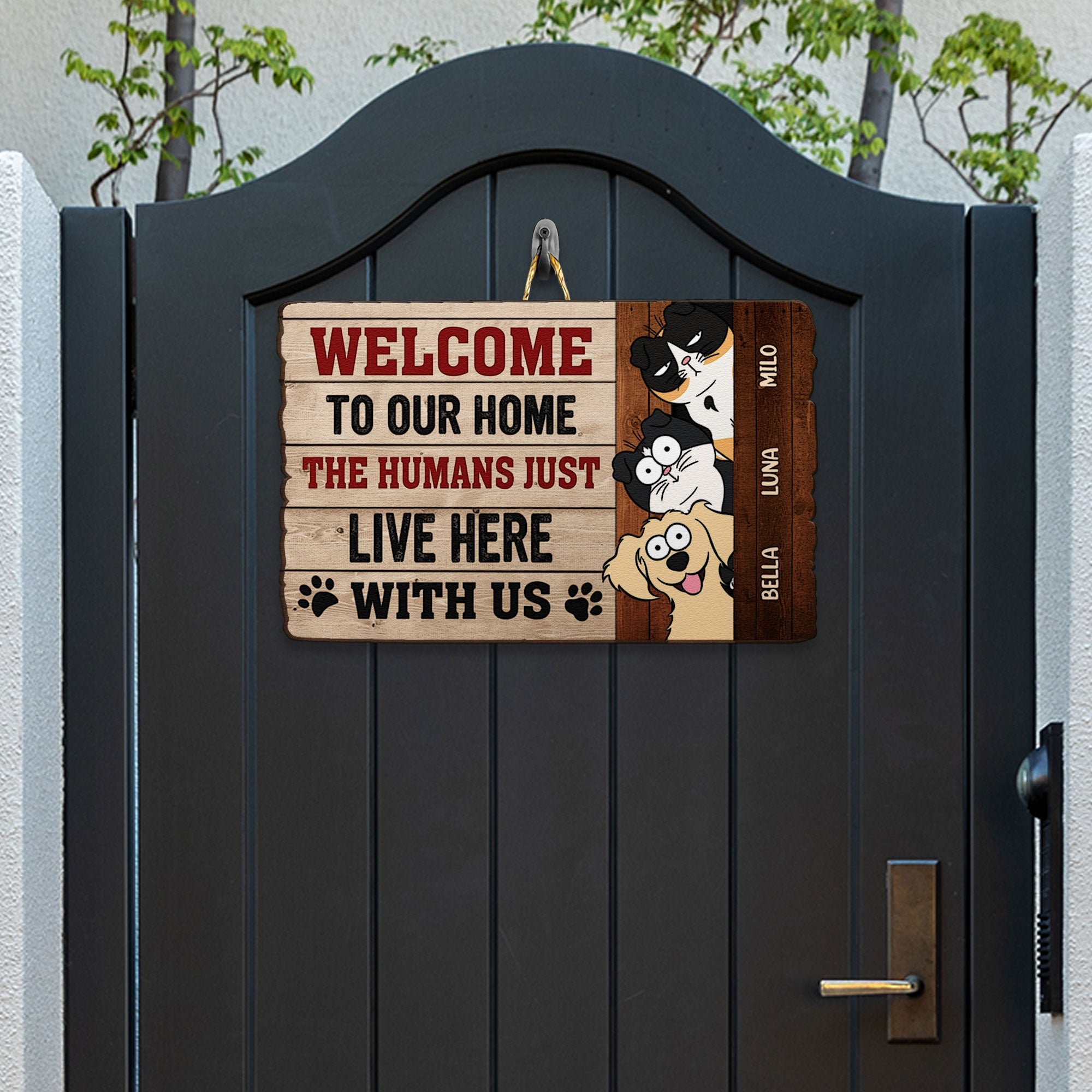 Welcome To Our Home The Humans Just Live Here With Us! Embrace the joy of pet companionship with our Personalized Custom Shaped Wood Sign, a heartwarming gift perfect for pet lovers, cat enthusiasts, and dog devotees alike. Celebrate the special bond between humans and their furry friends with this charming gift, ideal for birthdays and any occasion that calls for a touch of personalized love and warmth.