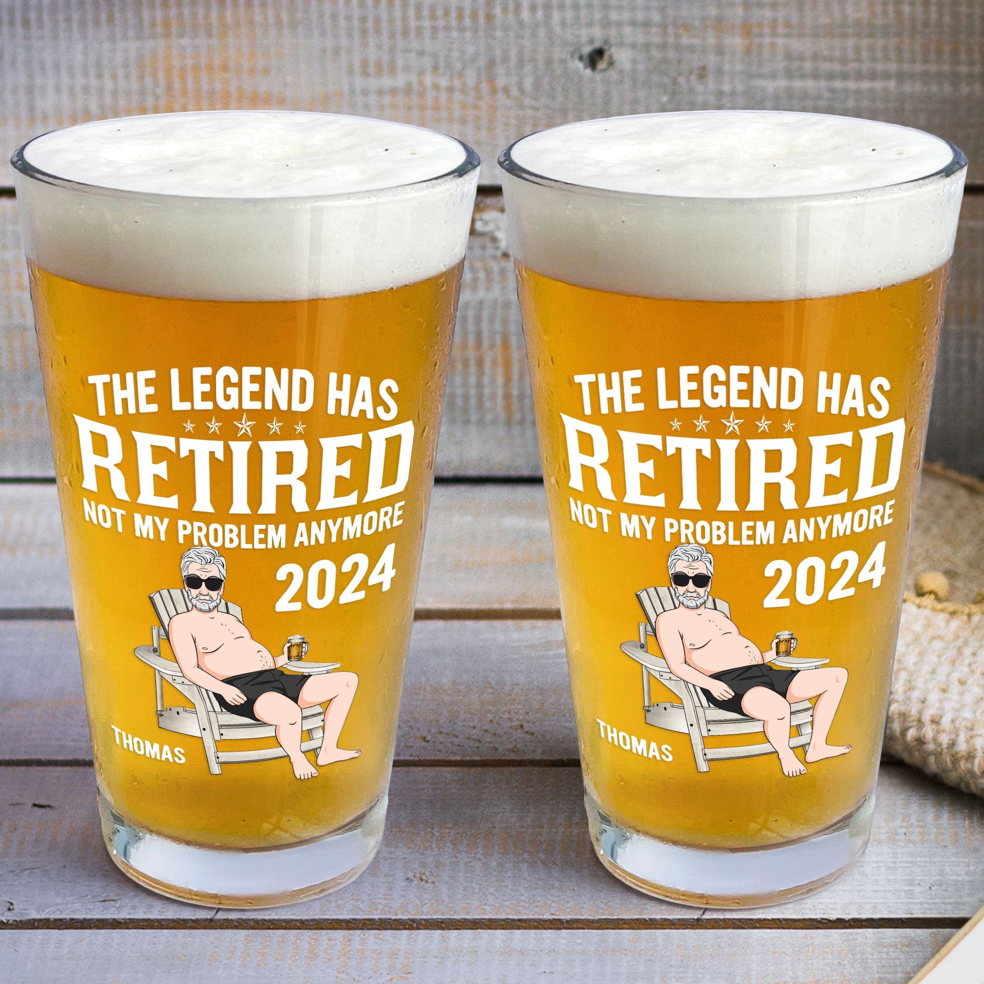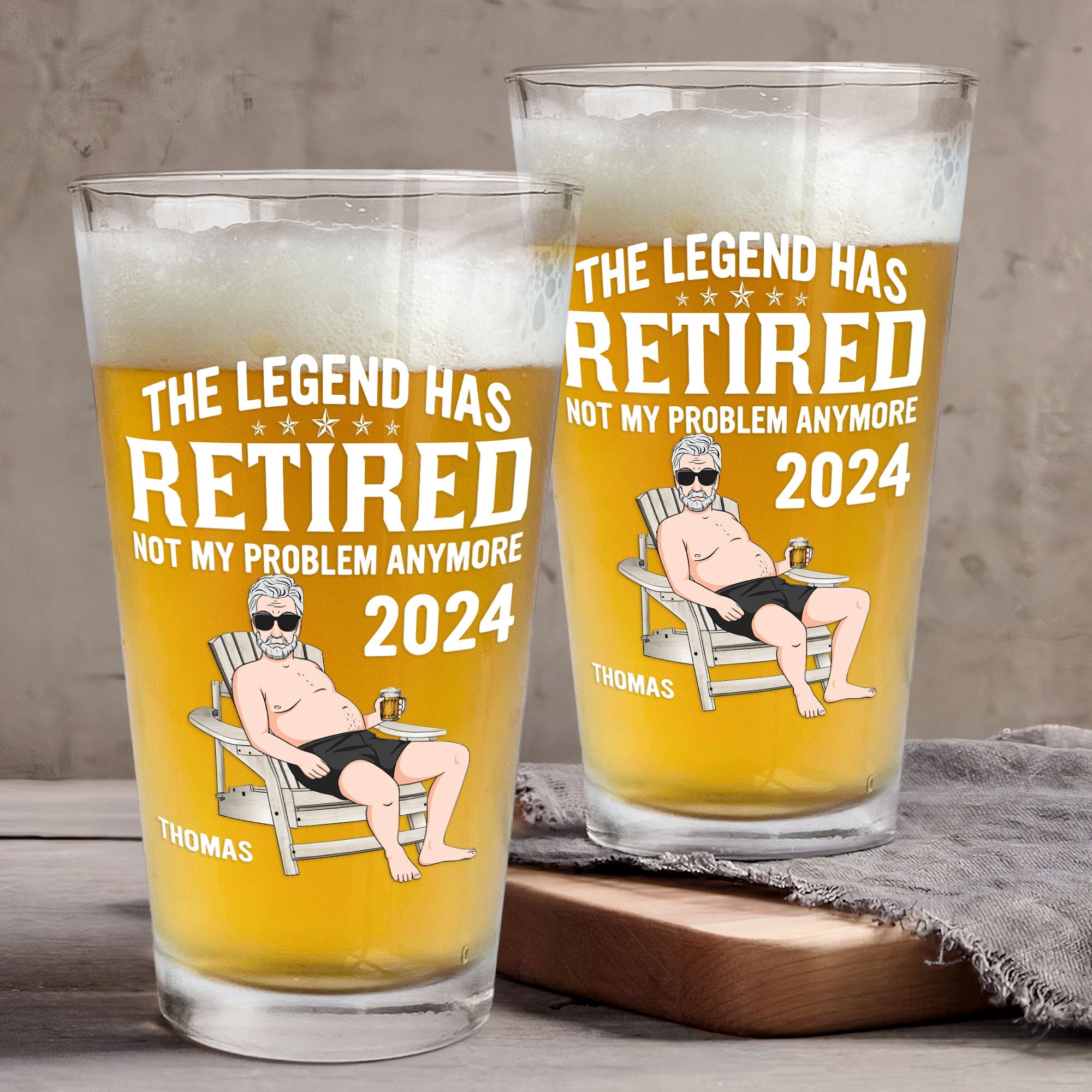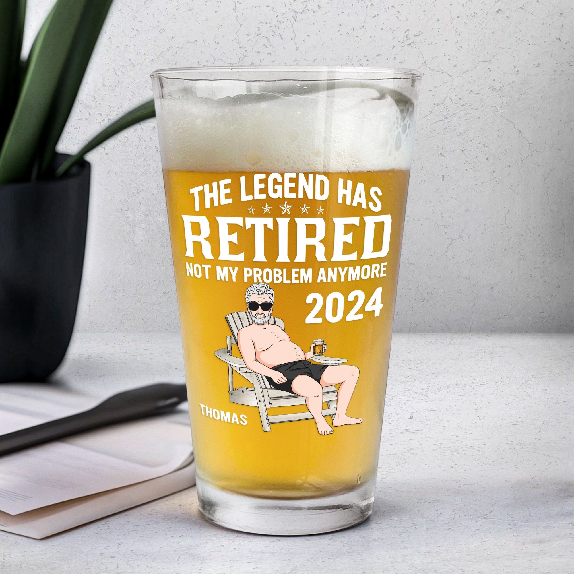 Designed to capture the essence of relaxation and leisure, our beer glass features a classic silhouette adorned with the endearing title "Retired" and a symbolic image representing relaxation, such as a hammock or a fishing rod. These playful embellishments add a touch of charm and whimsy to the glass, reflecting the newfound freedom and excitement that come with retirement. What sets our beer glass apart is the opportunity for personalization. Print the name of the retiree onto the surface of the glass, creating a bespoke keepsake that celebrates this special milestone in their life.