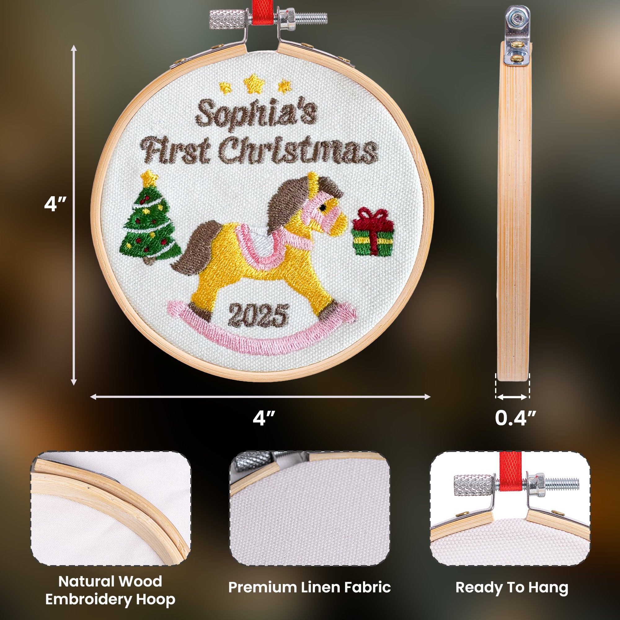 Introduce the joy of your baby's first Christmas with our charming Embroidered Ornament. Celebrating the bond between parents and their newest family member, this keepsake becomes even more endearing with each passing year. Conveying the sentiment of the first festive season, this adorable ornament beautifully captures the spirit of love and happiness. It’s perfect for newborn occasions, birthdays, Christmas and anniversaries. A true embodiment of the holiday spirit, it's an excellent way to keep this precious memory alive year after year.