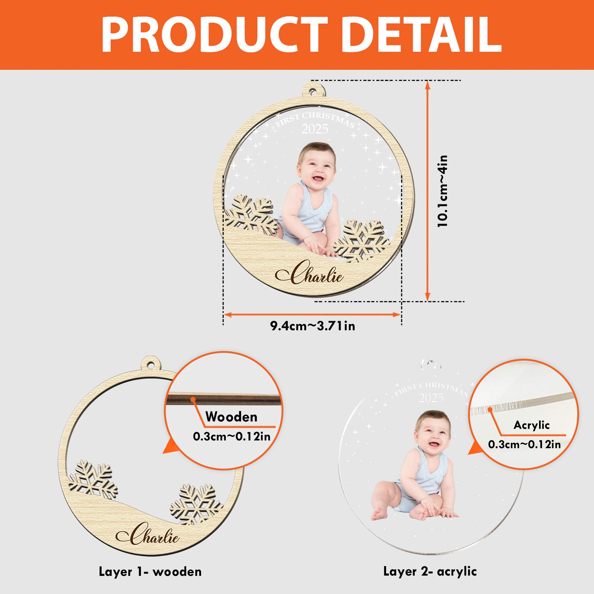 Capture the magic of your baby's first Christmas with our high-quality personalized photo wood and acrylic ornament. Customized with your precious newborn's photo, this beautiful keepsake celebrates the joy of this special season. The charming "Baby's First Christmas" design, complete with a delicate snowflake, adds an extra touch of wonder. It's not just an ornament; it's a heartfelt gift for your family, grandparents, mom, dad, or a cherished memento for your little one. Make this holiday unforgettable with a perfect ornament that marks a momentous occasion.