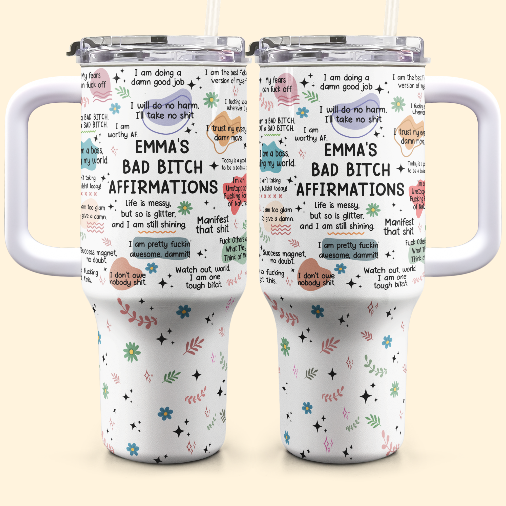 Boost confidence and bring a smile with the Bad B*Tch Affirmations Personalized 40oz Tumbler! Perfect for coworkers, friends, or even yourself, this funny tumbler features sassy affirmations to brighten anyone’s day. Complete with a straw and customizable details, it’s a unique blend of style and humor. Ideal for Christmas, birthdays, or any occasion, this tumbler is the go-to gift for bold and fearless personalities!