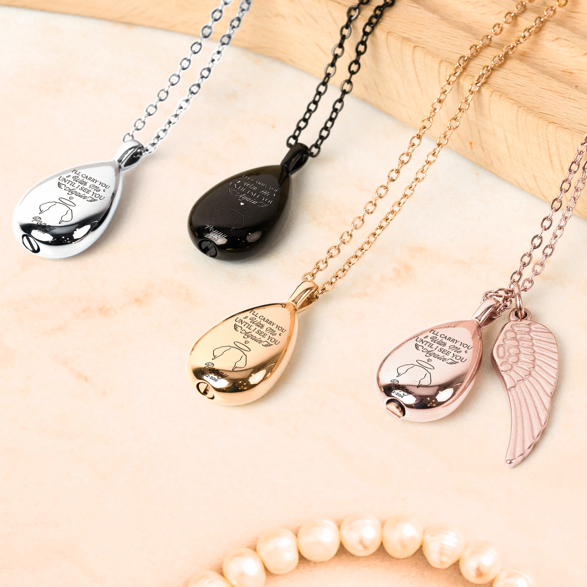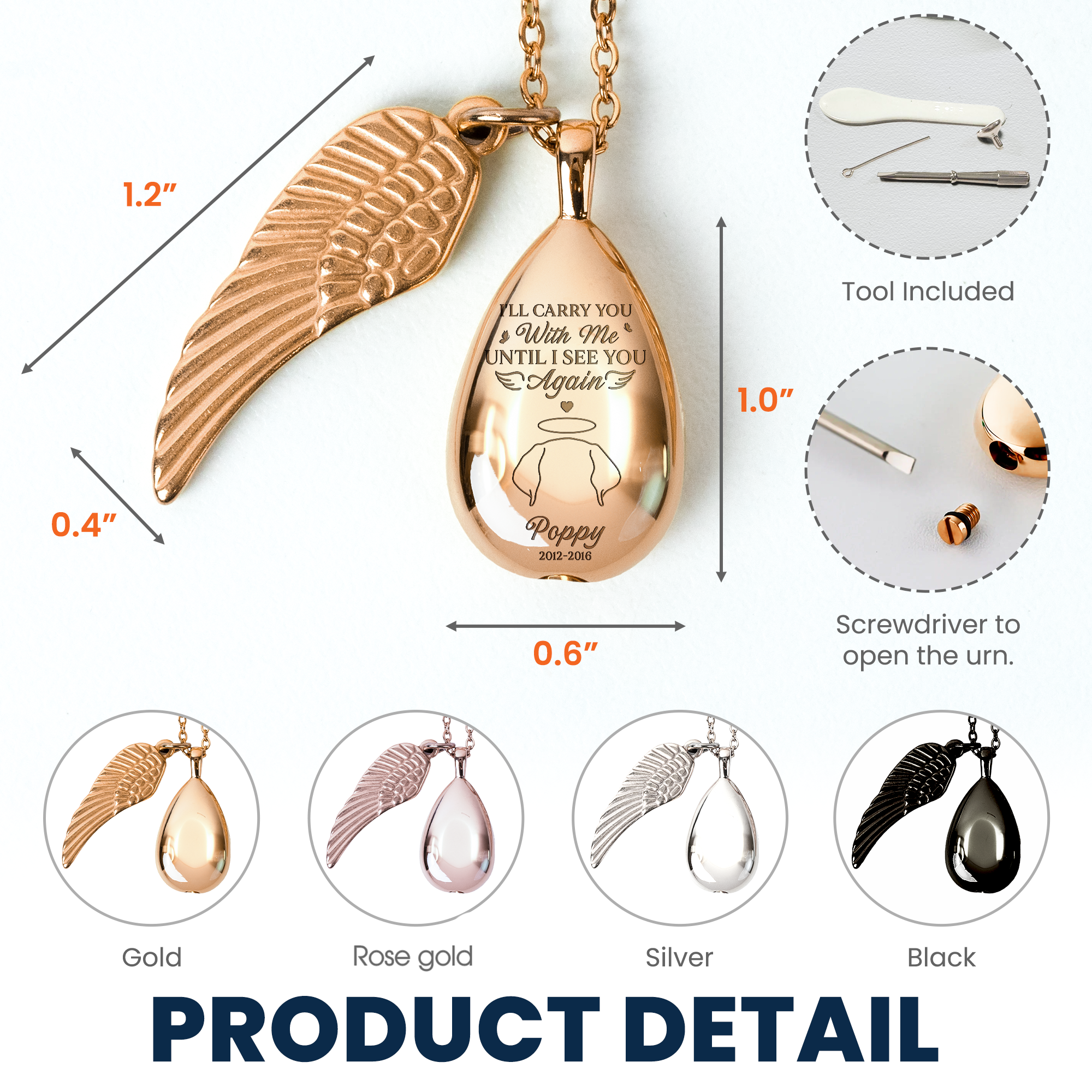 - Wing Charm: 30 x 10 mm. - This necklace has an empty urn-shaped pendant to hold ashes or can also store hair, pictures and small keepsakes of loves, keep their memory always close to your heart.