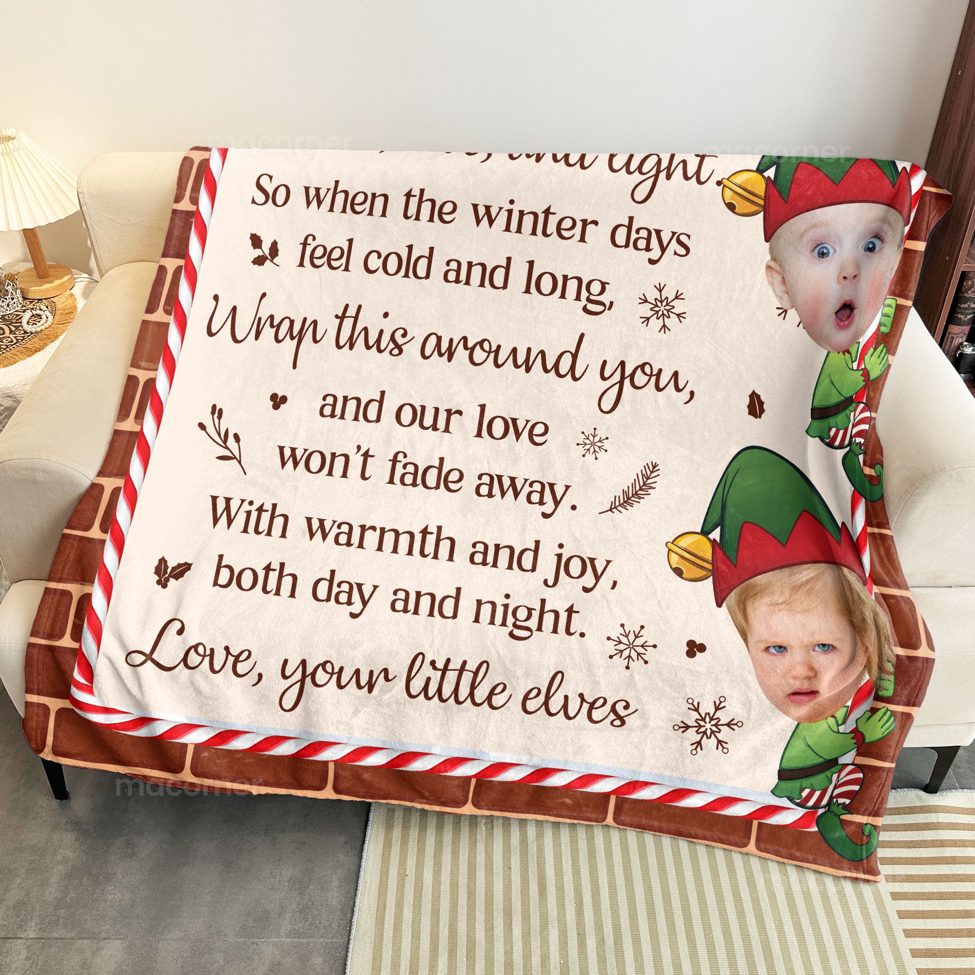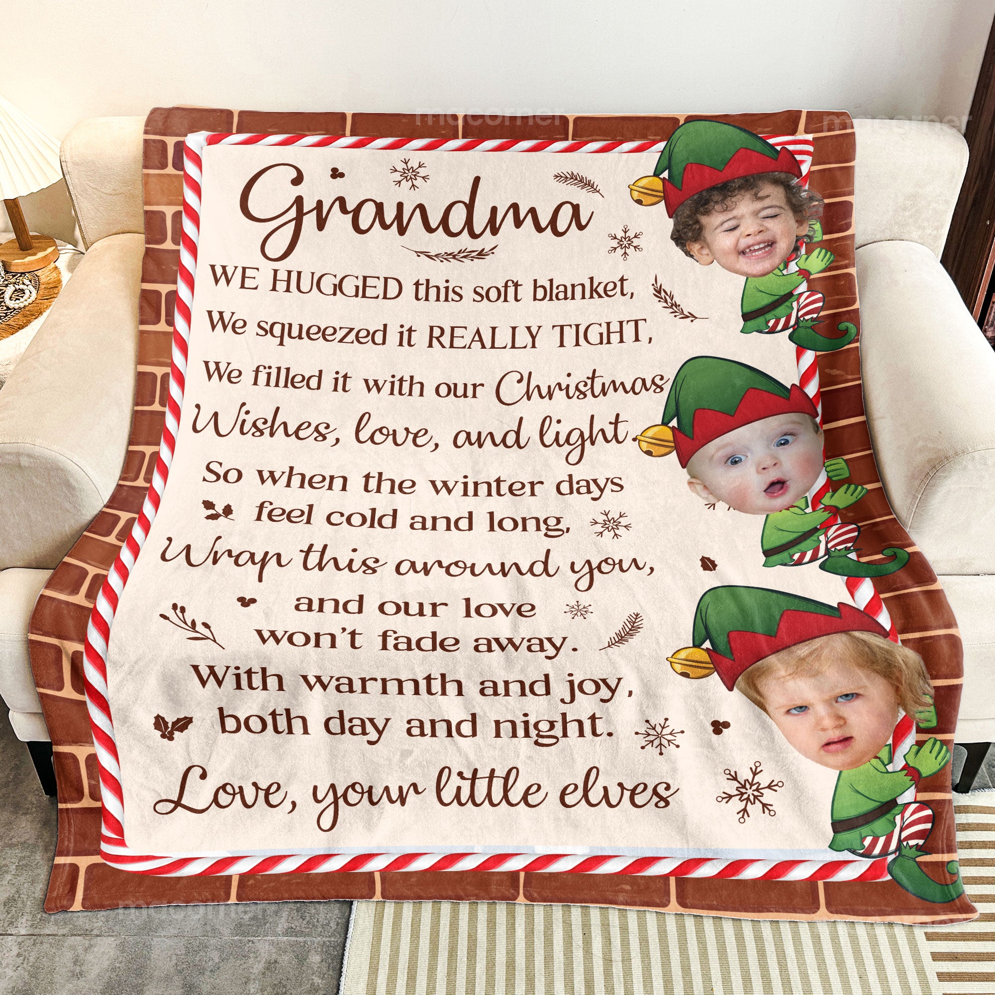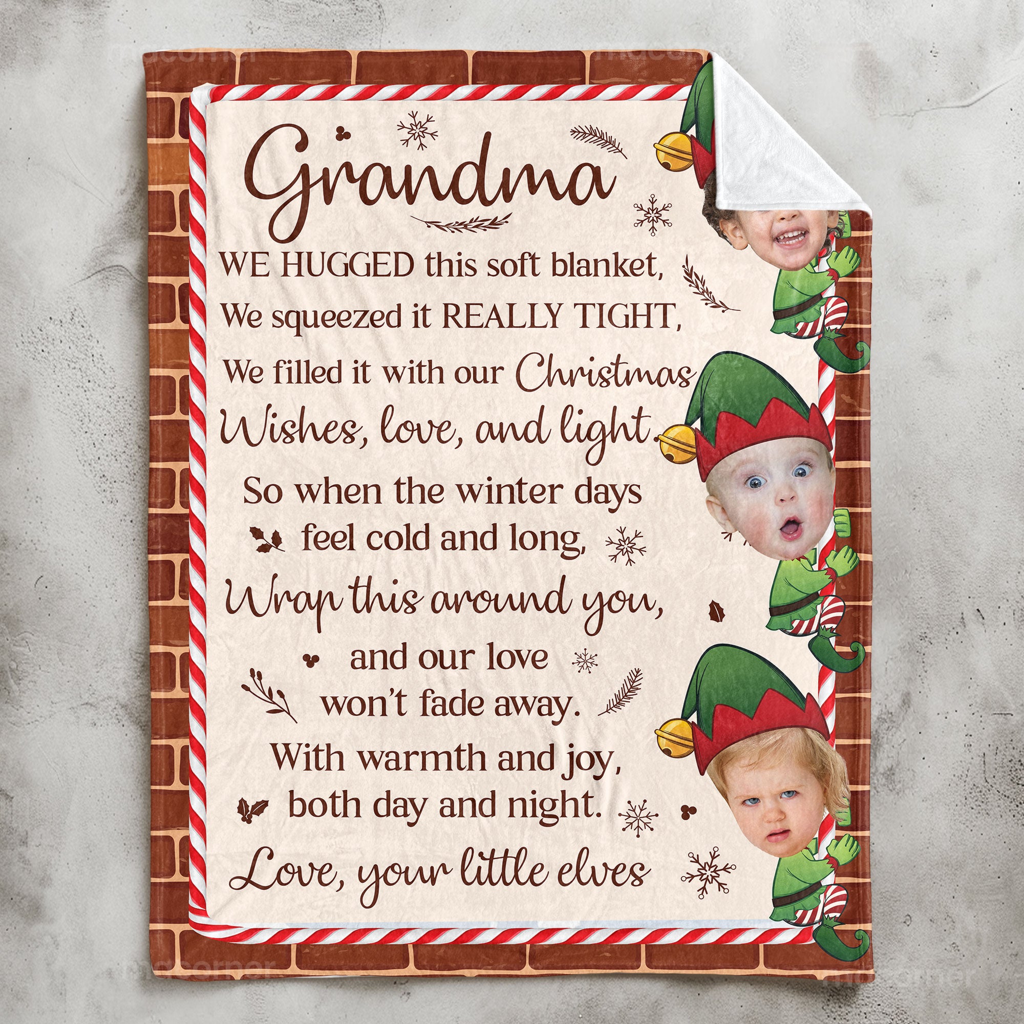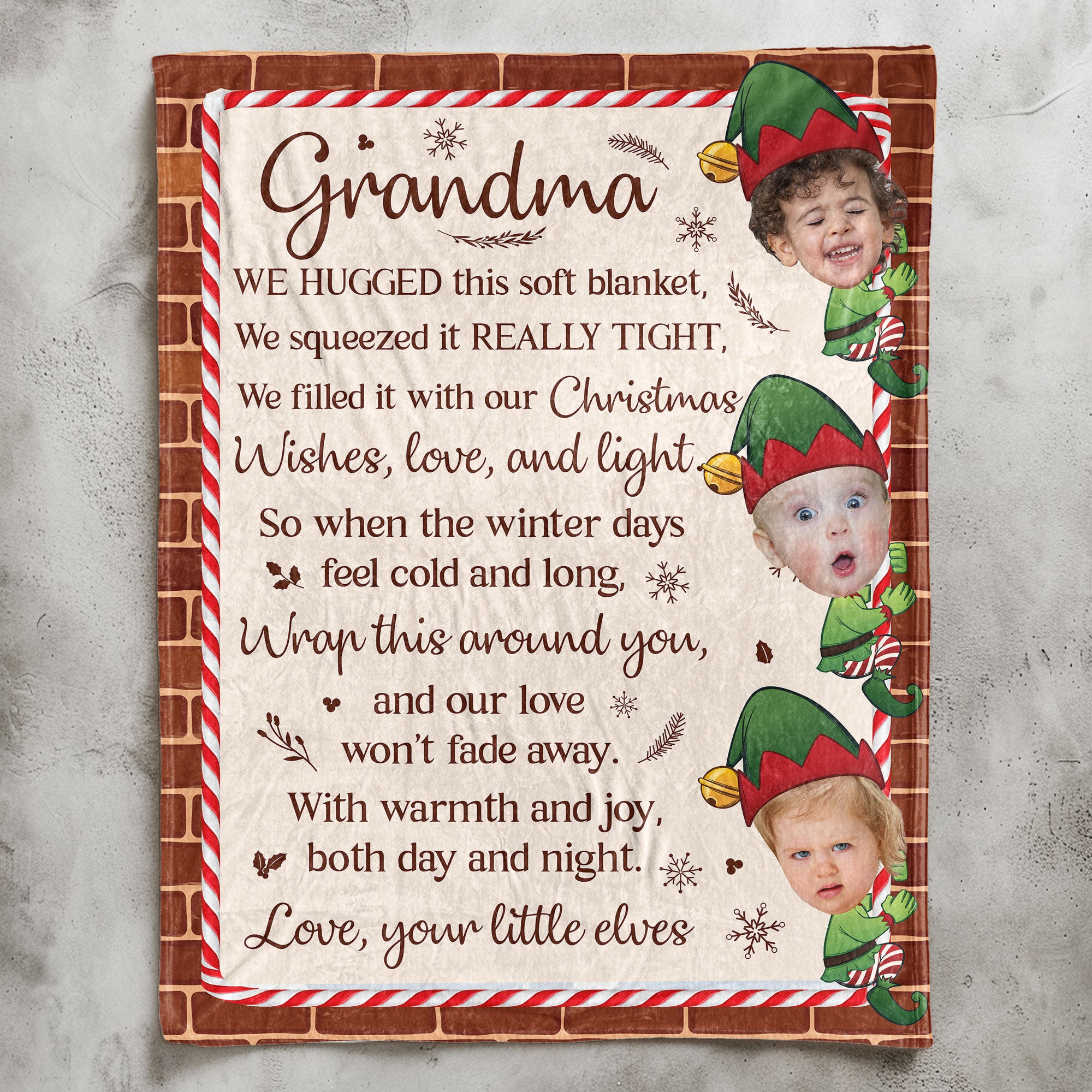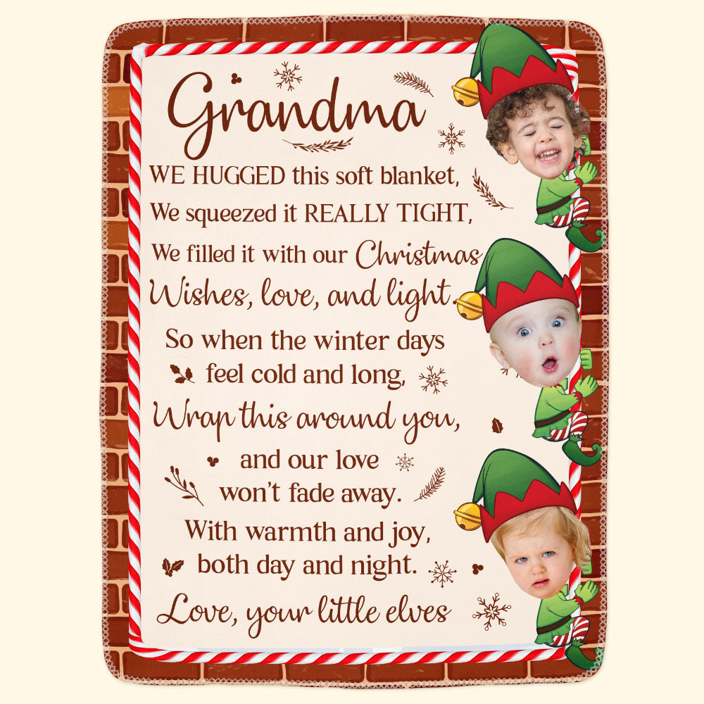 Whether it's for Grandma, Nana, or Gigi, this blanket brings comfort during cold winter days, reminding her of the love and warmth shared by her little elves. Perfect for snuggling up during chilly evenings, it’s more than just a winter gift—it’s a symbol of the joy and affection that fills the holiday season. Give the gift of warmth and love with this special, heartwarming keepsake!