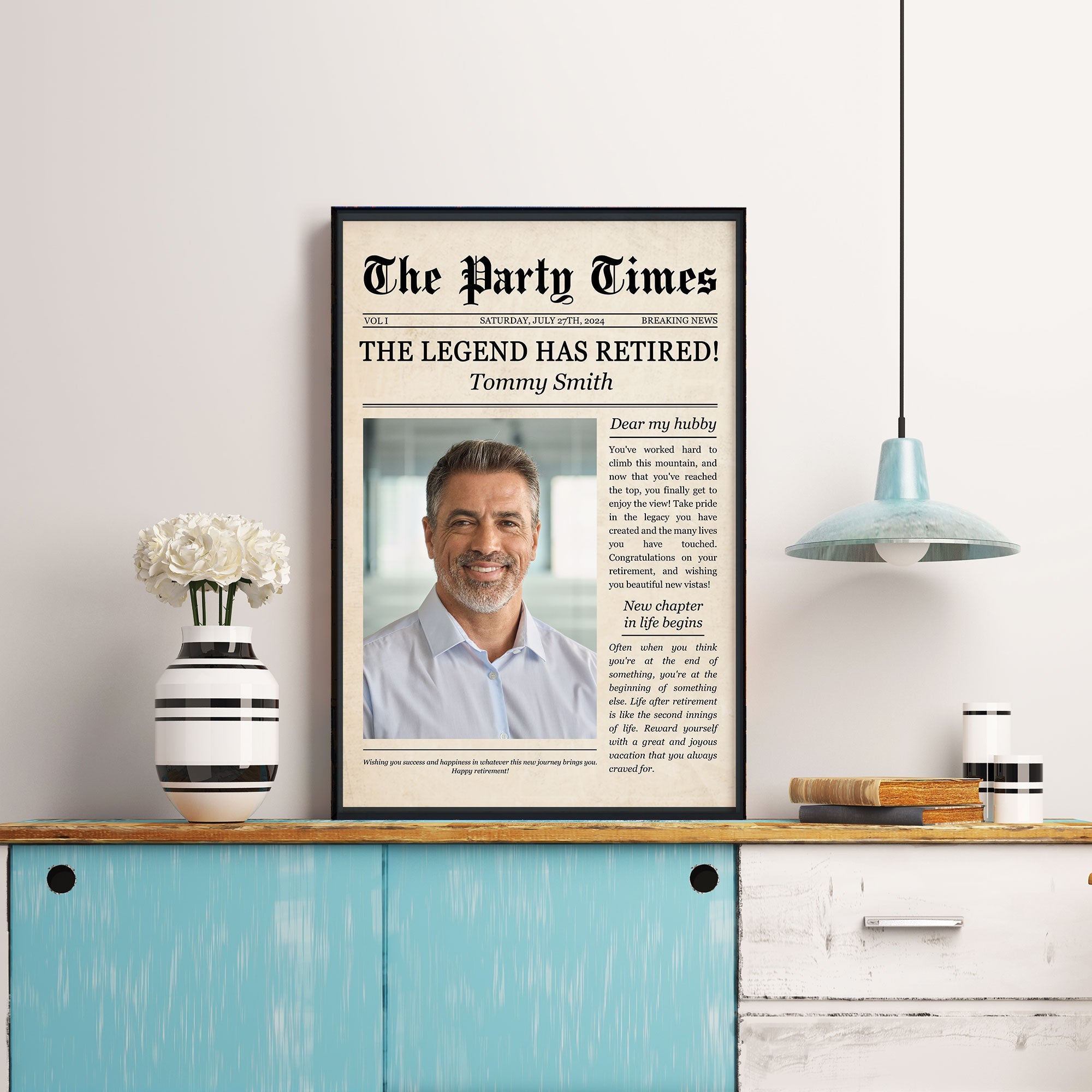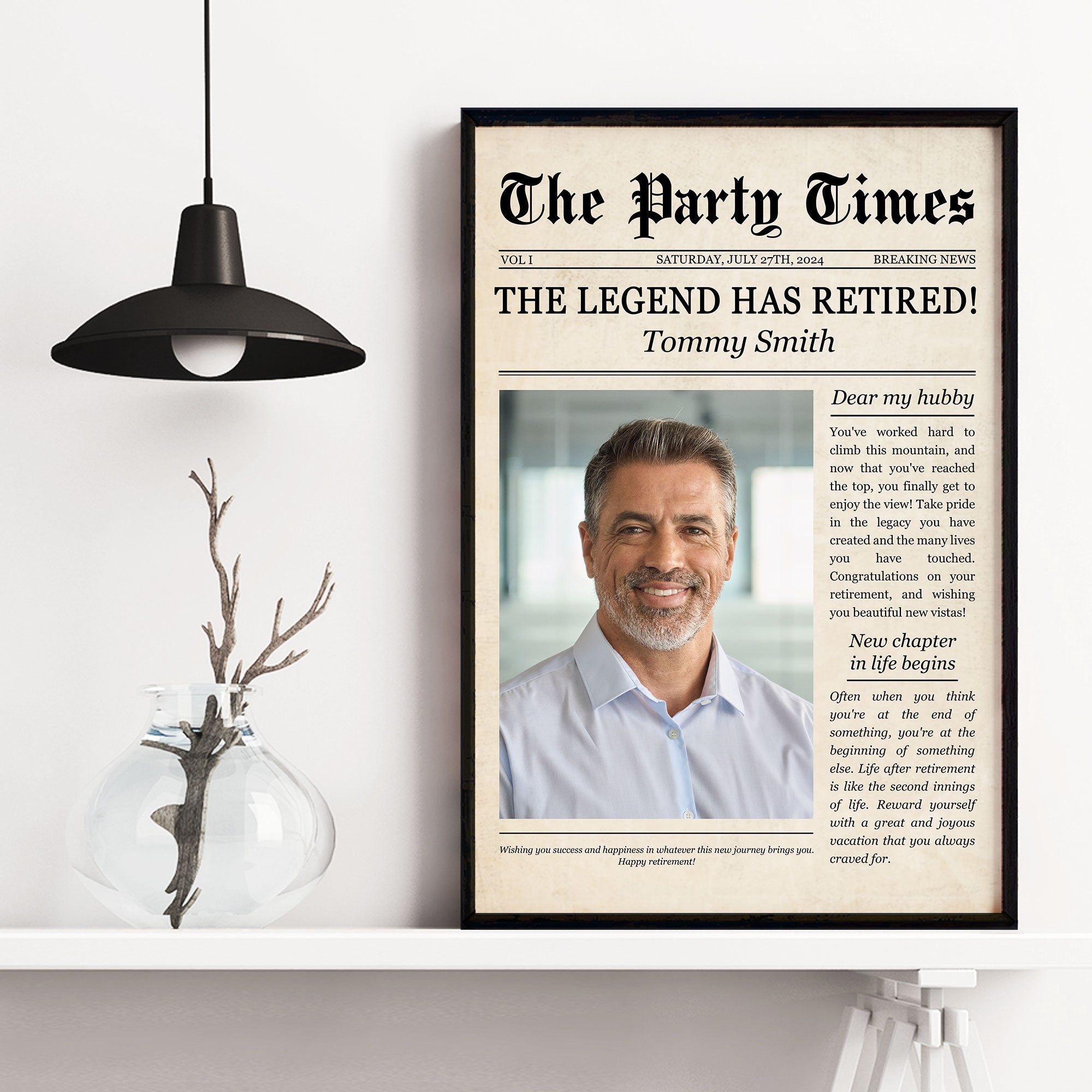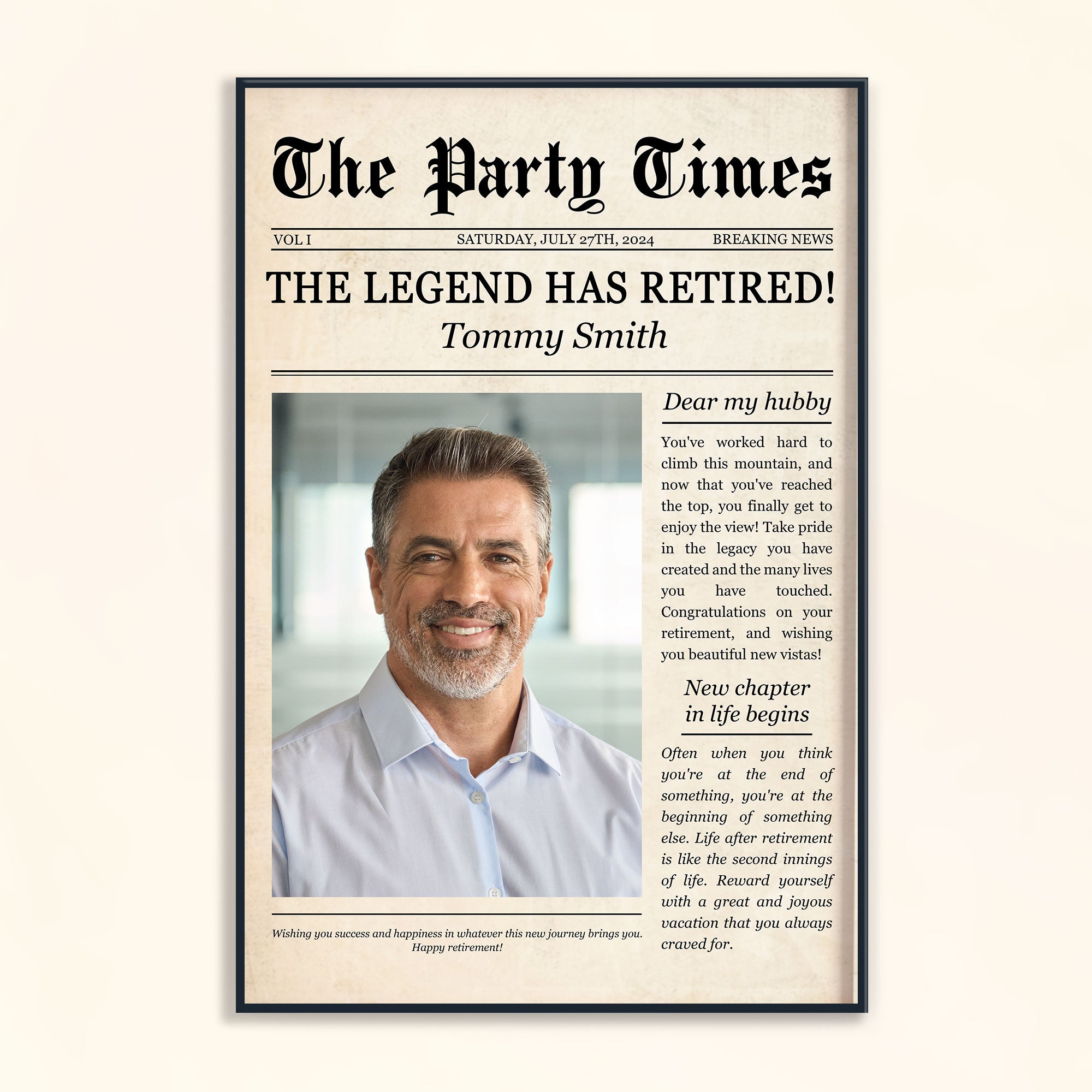 Celebrate their incredible journey with our Personalized Poster featuring a unique retirement theme newspaper design. This thoughtful and stylish keepsake is the perfect way to honor their career accomplishments and commemorate the milestone of retirement with a creative and personalized touch. What sets our poster apart is the opportunity for personalization. Customize the newspaper design with their name, retirement date, career highlights, and other key details to create a bespoke keepsake that tells their unique story. Add quotes, anecdotes, or photos for a truly one-of-a-kind memento that captures the essence of their professional journey.